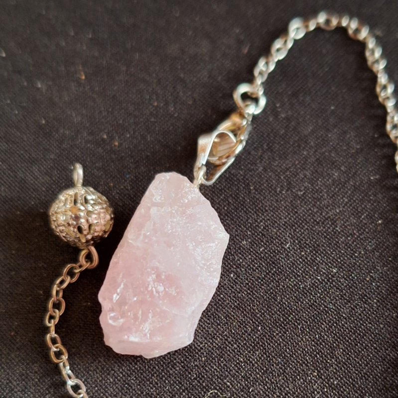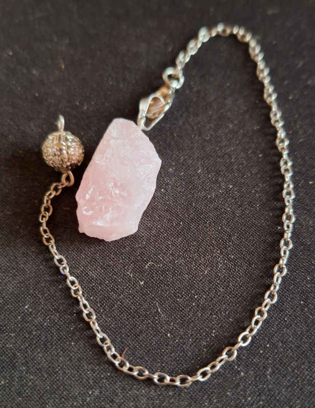 Ruwe Rozekwarts pendel aan een zilverkleurig pendelkettinkje.